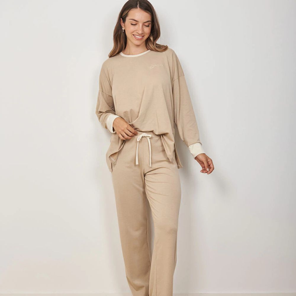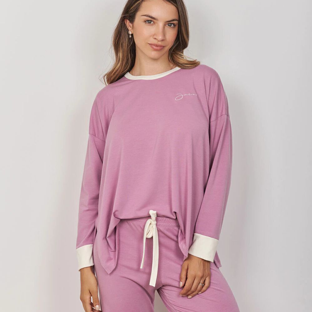 Pijama Jaia Articulo 24037 OCTAVIA. Este conjunto incluye una remera lisa y un pantalón con estampado cuadrillé, ofreciendo un equilibrio entre simplicidad y diseño atractivo. Pijama suelto tejido suave que proporciona máxima comodidad. Lazo ajustable y puños en contraste que añaden un toque distintivo.