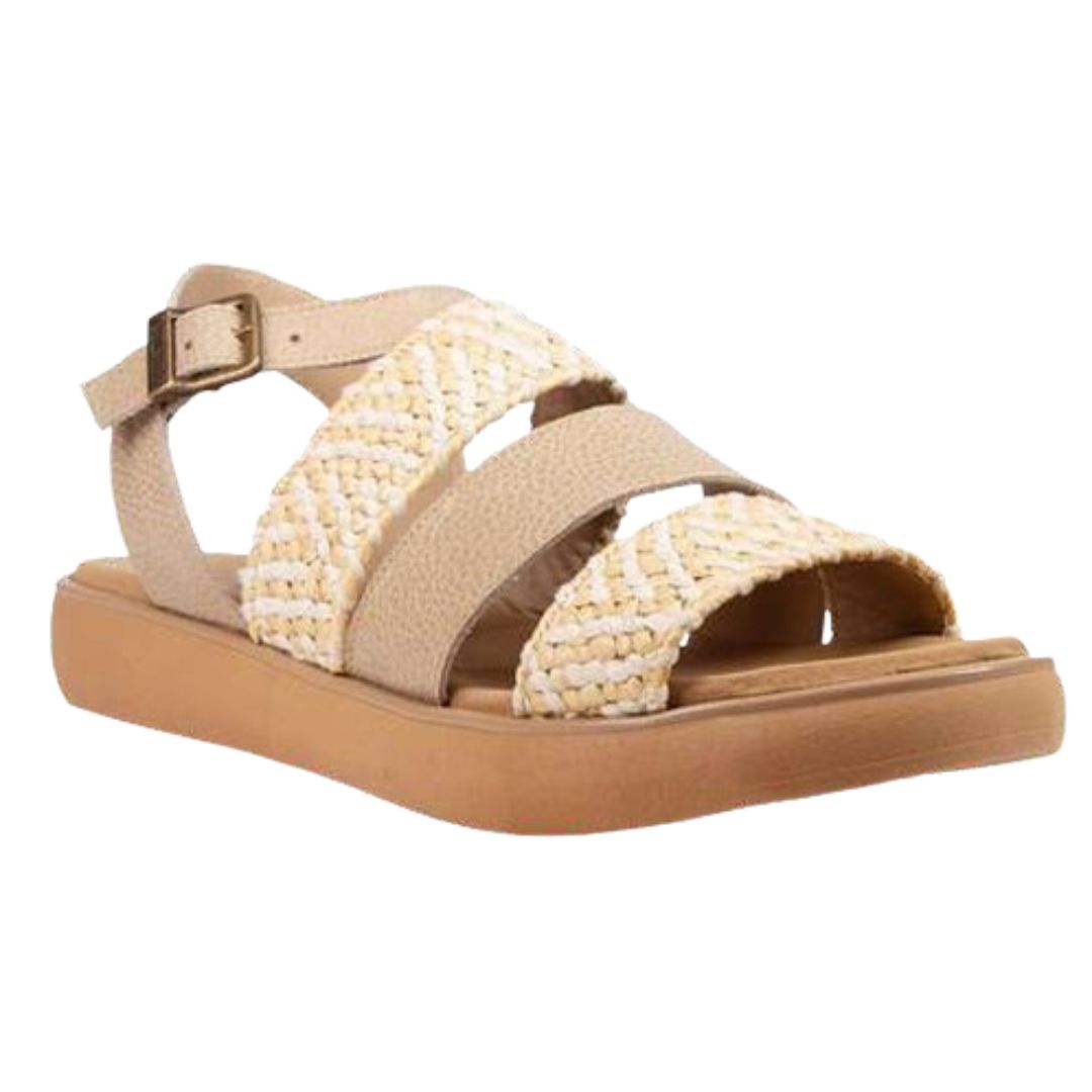 Sandalias Poncia, confeccionada en cuero con detalles de hebilla y tramado de distinto color.